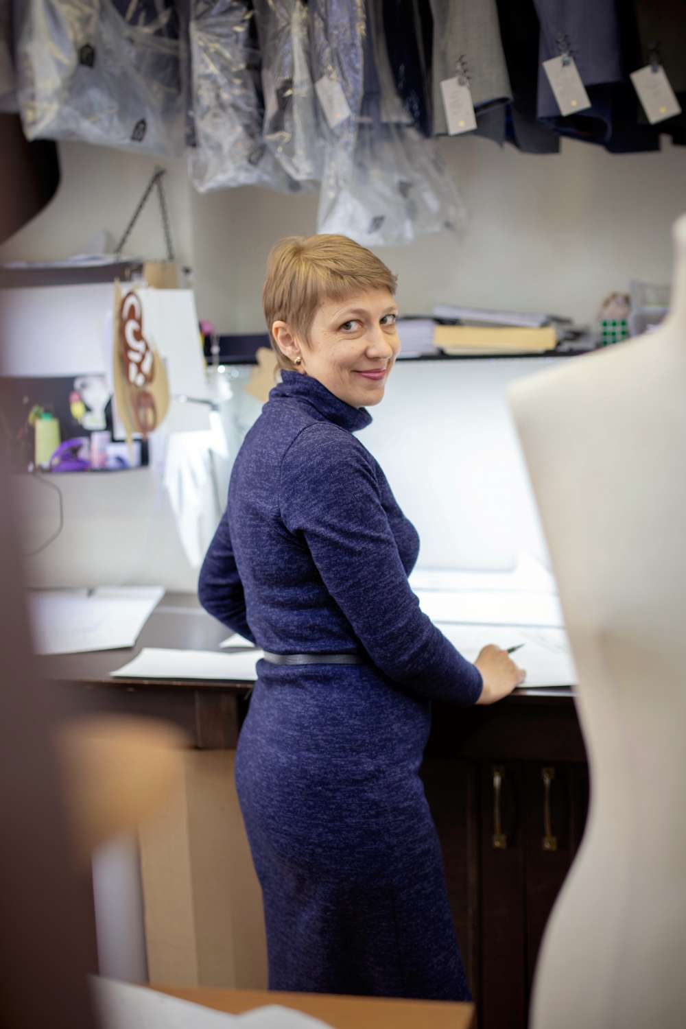 В Indposhiv я - конструктор. Строю индивидуальные лекала пиджаков, жилетов, пальто, тренчей, всех верхних плечевых изделий (ВПИ). Закройщики снимают мерки, делают фото клиентов спереди, сбоку и сзади, мы все это анализируем, они мне высказывают свое видение конструкции, поскольку опыта и знаний у них больше, и я переношу все это на бумагу.